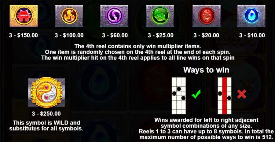 The game has unlimited betting options where you can choose from. The highest-paying symbol is the pagoda. Fire, air, rock, earth, and water are the least paying symbols. However, wild symbols substitute for both the high and low-paying symbols. Wild often appear in three reels and pays two and half times your bet suppose you land all of them.
