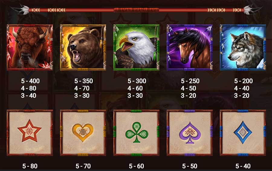On the game interface, you will find the five reels with 15 playlines in three rows. Likewise, you will see a canvas-like feature holding the symbols. These symbols include a star, playing card suit, and special animal symbols. Each animal has a different value. The bull attracts the highest value, and upon landing three, four, or five, you win two, four, or 20x of your total stake. Second in value is the bear, followed by the eagle horse and the wolf.